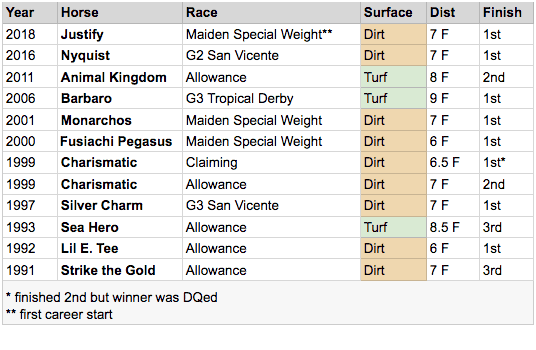 No winner has used the Jerome in the current configuration and no winner has used the Gotham in the time frame, so we’ve omitted them for now. The Florida Derby was in mid-March between 1990-2004, making it more likely to be a second-to-last prep than a last prep for much of this time span. Both here and in the individual path graphics we’ve used the contemporary name of the race. For example, Charismatic won the Santa Catalina in 1999, today that race is known as the Robert B. Lewis.
