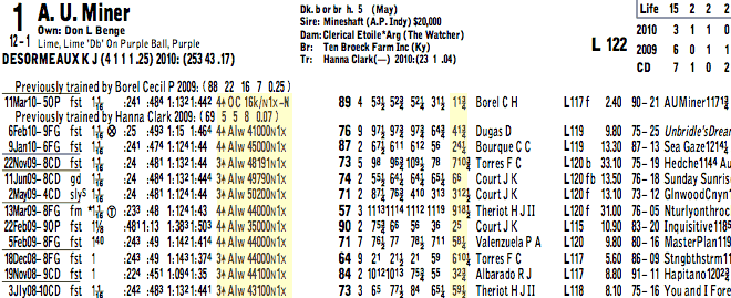 It took A. U. Miner three tries at the maiden special level to get his first win, and then he started 11 times in first-level allowances, never running better than second. Dropped into an optional claiming race for $16,000, he earned his second win in 15 starts. In the race below, an allowance for non-winners of two races at Churchill Downs on May 1, 2010, he is rising to a level at which his long toil in the first-level allowance ranks suggests he won’t be quickly successful: