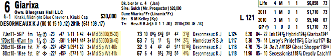 Giarixa began his career in two maiden special events at Keeneland, a track that showcases better Thoroughbreds. He lost both starts, his second by a poor 18 3/4 lengths. Given a respite, Giarixa returned at Tampa, a lower level track, in a maiden claiming race at the higher end. For the first time in his career, he showed speed from the start and finished second. Brought to Gulfstream, he was entered in another maiden claiming race in which he finished third. On January 30, he was entered in a maiden claiming at the same level: