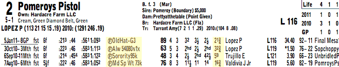 In the January 30, Grade 2 Forward Gal at Gulfstream Park, Pomeroy’s Pistol was a logical contender based on both past performances and condition. The filly won her debut, a maiden special at Monmouth Park. In her next start, a listed stakes, she finished fifth after pressing the pace early. Dropped back into first-level allowance company, she rebounded with a third-place finish, again after pressing the pace early. After being freshened, Pomeroy’s Pistol finished an excellent second at 34-1 in the Grade 3 Old Hat. In this race, she was making her second start of the year, and improvement could be expected: