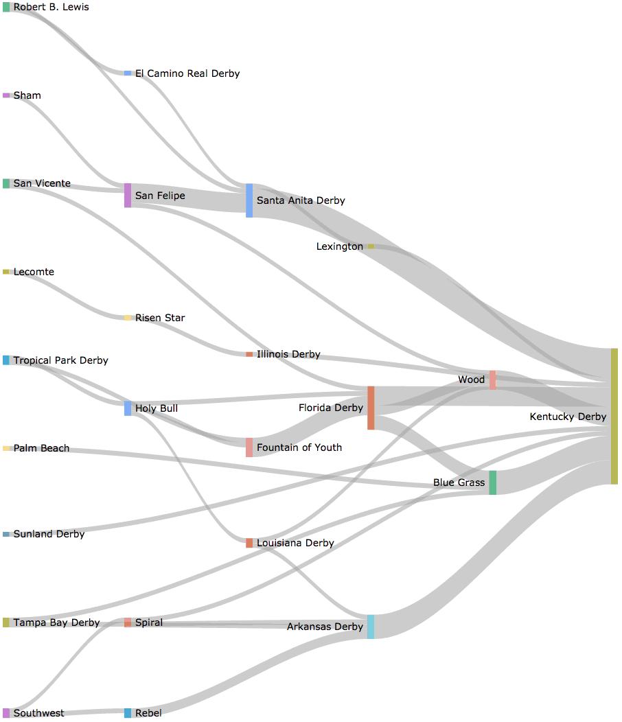 You can hover over or touch each path for a list of horses that took the route. For example, if you hover over the path between the Tropical Park Derby and Fountain of Youth you’ll see that Unbridled took that path in 1990. The widths of the paths are relative to the number of horses that took the path — the wider the path, the more horses that took that path.
