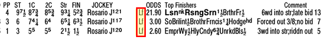 Front bandages are marked in past performances with a small “f” in the equipment column. When Goose, noticing the bright pink bandages on Escalante’s horse in Santa Anita’s saddling enclosure, remarks that the horse didn’t wear wraps the last time he ran, that’s where he’s getting the info. Bandages aren’t an announced equipment change, which is another good reason to check out horses in the paddock before placing any bets!